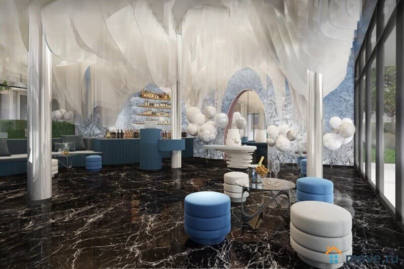 Комплекс включает семь 7-этажных зданий, выполненных в современном стиле с использованием натуральных материалов. Интерьеры и экстерьеры вдохновлены океанскими формами и создают атмосферу гармонии и умиротворения.