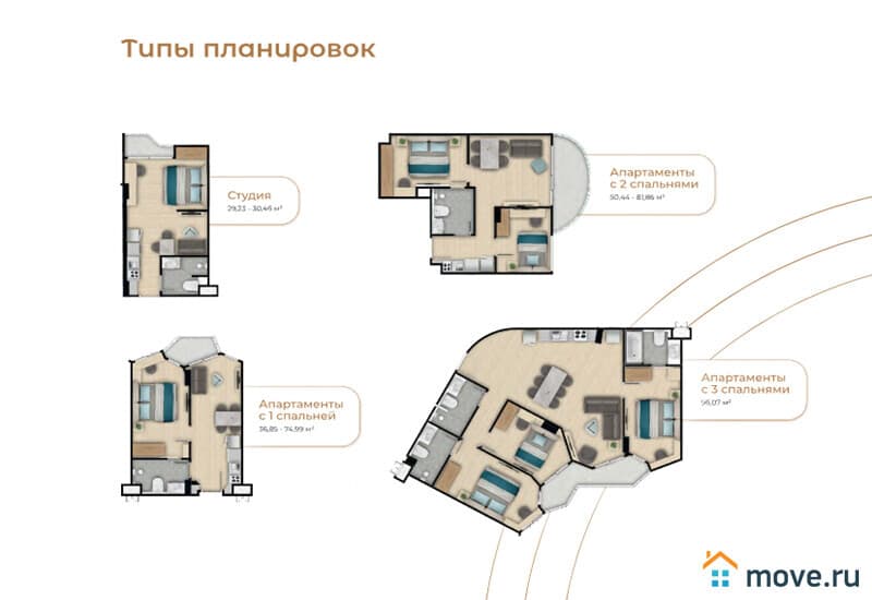 Спальни: студии, 1, 2, 3